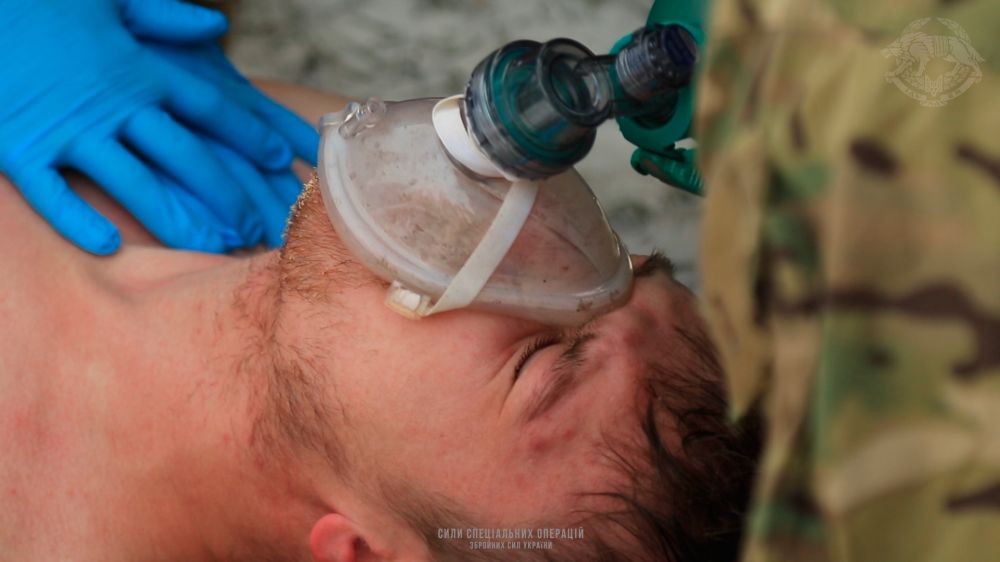 Інший етап тренувань - надання першої медичної допомоги потерпілому в польових умовах. Воїни ССО опрацьовують ситуацію, коли постраждала людина не може дихати при ознаках спазмової реакції організму.