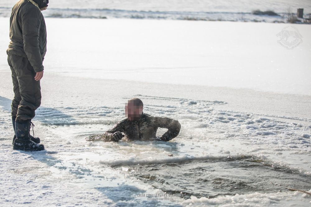 Морозним ранком колона військових авто прибуває до місця тренування - берега великого озера. Зимовий циклон, що приніс Україні сніг і двадцятиградусний мороз, тут відчувається сповна. Водойма вкрита товстим шаром криги, а відкриті ділянки тіла замерзають тільки-но виходиш на свіже повітря. І хоча група забезпечення заздалегідь підготувала ополонки для навчання, через мороз ті швидко вкриваються льодом - повсякчас його доводиться пробивати палицями.