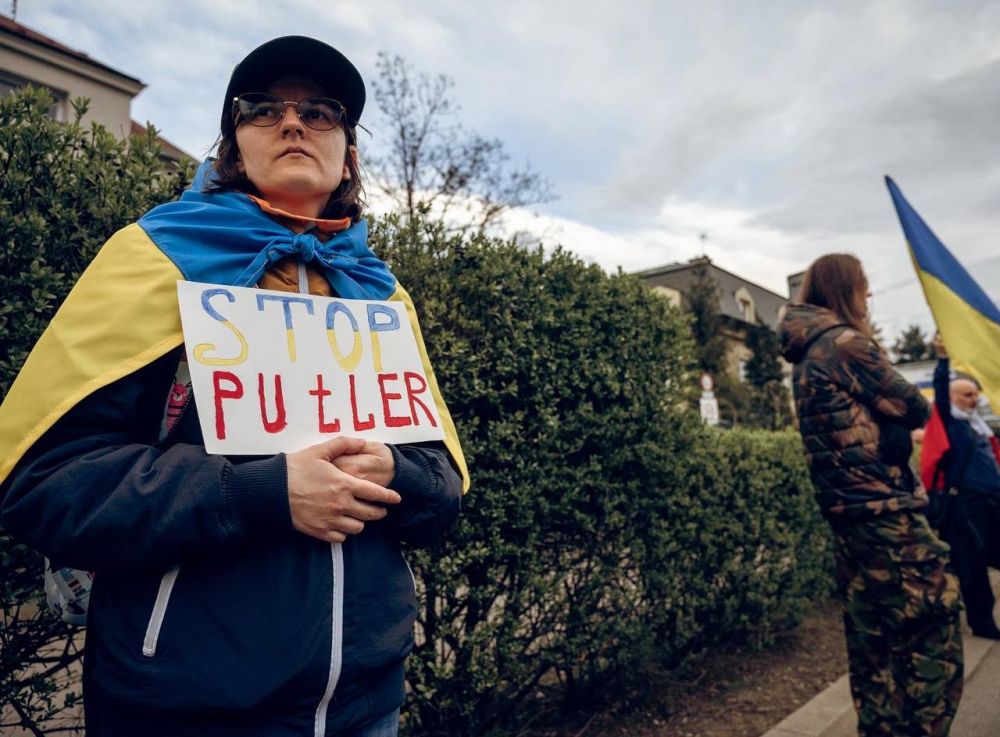 Люди несли синьо-жовті прапори, на одному з яких великими літерами написали «Ми з вами». Також люди скандували: «Мовчання це насильство», «Зупинити другого Гітлера», «НАТО, закрий небо».