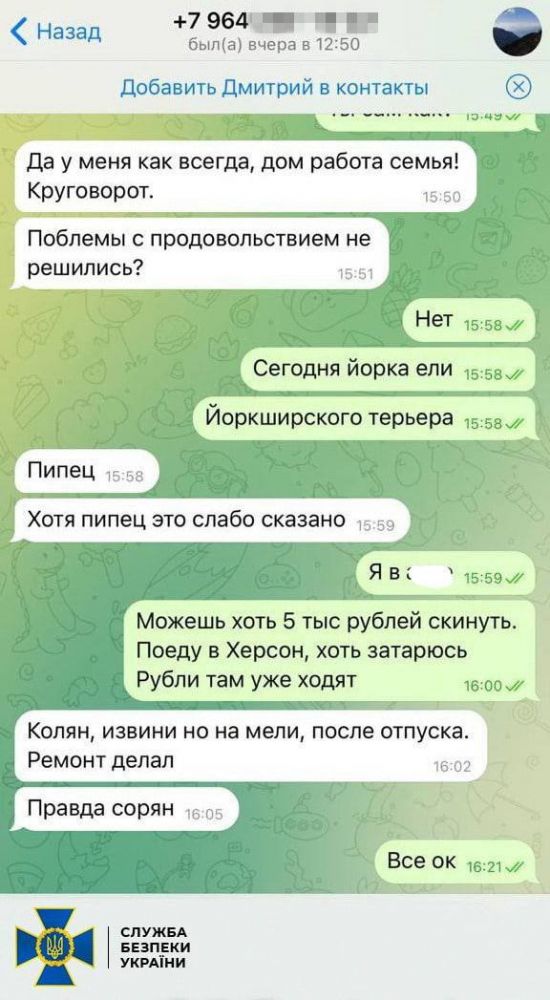 💬 «Всё х*ево. Нас укры е*ут, как молодых. Собак едим, жрать нечего. Сегодня йорка ели. Йоркширского терьера», – пише своєму знайомому окупант, що перебуває на тимчасово окупованій території Херсонщини.